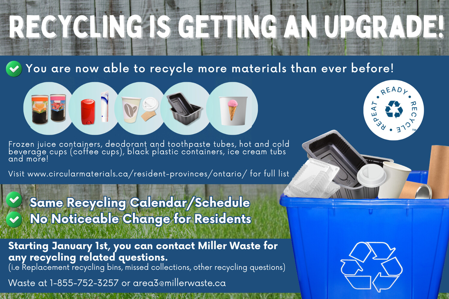 For recycling related questions (replacement recycle bins, missed collection, etc.), contact Miller Waste: Waste at 1-855-752-3257 or area3@millerwaste.ca
