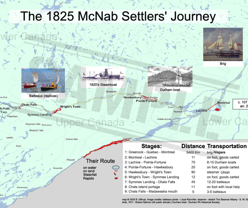 Created for this commemoration, Map 1 shows the route traveled by the 1825 McNab settlers after their arrival in Montreal and their means of transport in Canada. Most of the travel was by water and included an overnight trip on the first-ever steamboat on the Ottawa, the Union. Many place names shown changed after 1825.