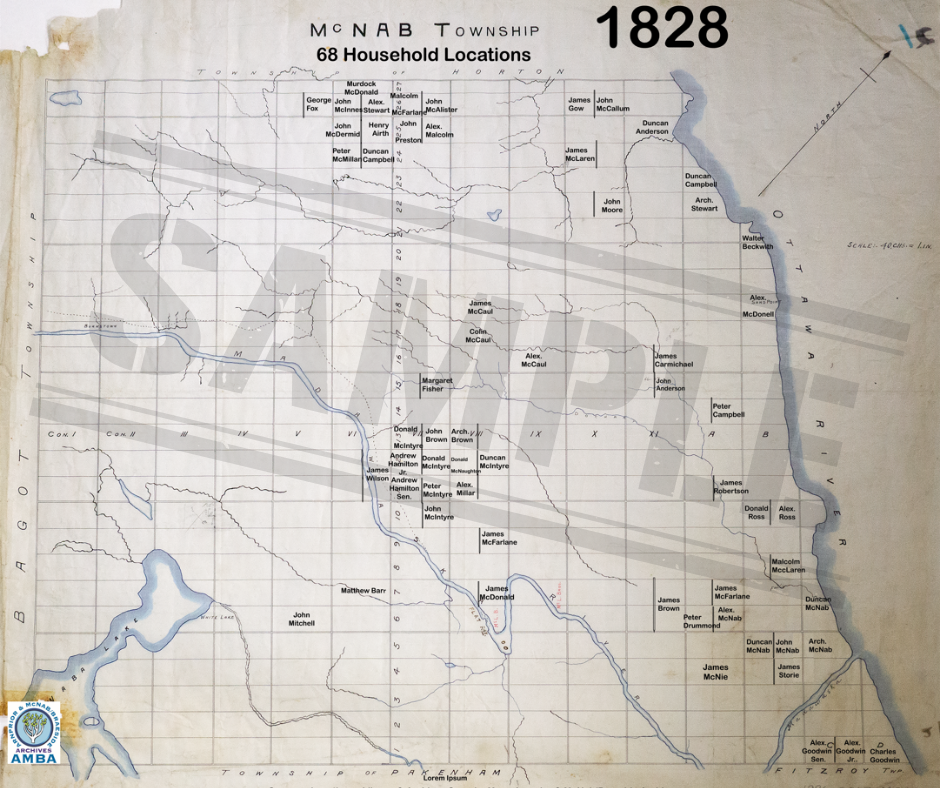 These locations were reported to the government by Arch. McNab as Land Agent. A “location ticket” gave the holder exclusive right for seven years to settle and clear a lot. Only once sufficient land was cleared could the settler apply to own the land. Often, a settler family would find its first or subsequent location unworkable, abandon it, and move on to try again. Map 2 plots the 1828 locations on an early copy of the 1824 survey.