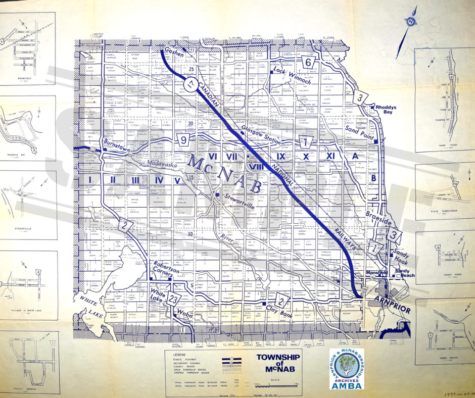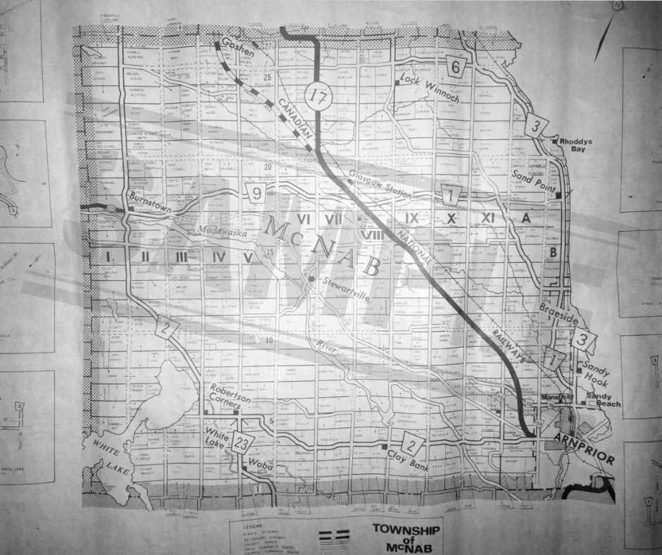 Map 7 was used by Peter Hessel when working on McNab – The Township (1988). Newly drawn, it has the dam, head pond and Hwy 17 bypass at Arnprior, but its railways are a fantasy. The marginal street plans are gone, and lot lines are faint or missing.